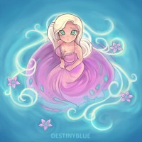 an ethereal feel to the scene. There's also a small cluster of flowers floating near her, which adds to