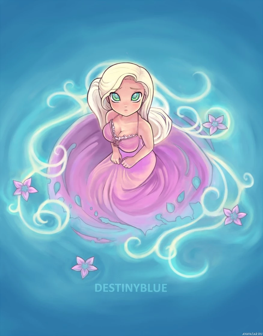a pink dress that resembles mermaid tail fins at the bottom. Her pose is relaxed, with her hands resting on her knees. Surrounding her are swirls of blue and purple colors, giving