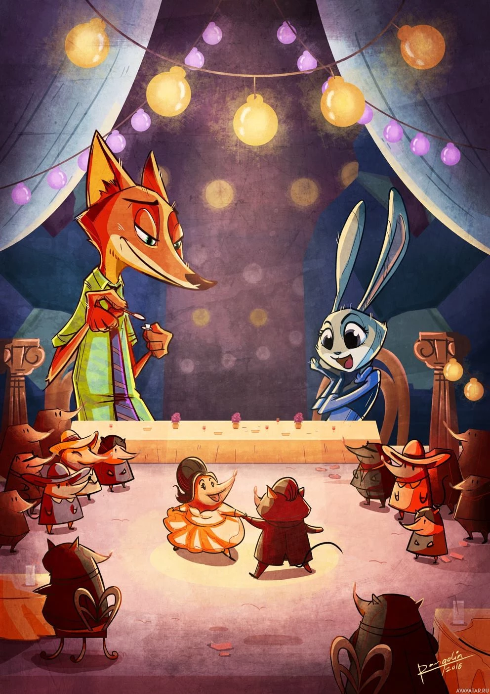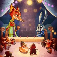 an animated movie. In the center, there is a fox character dressed as a jester or court jester with