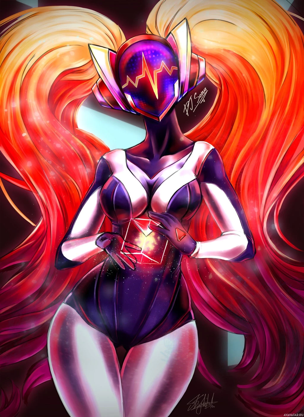 a female character from the video game "League of Legends." She is depicted with purple and red hair, wearing