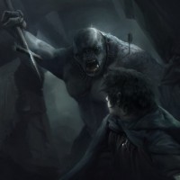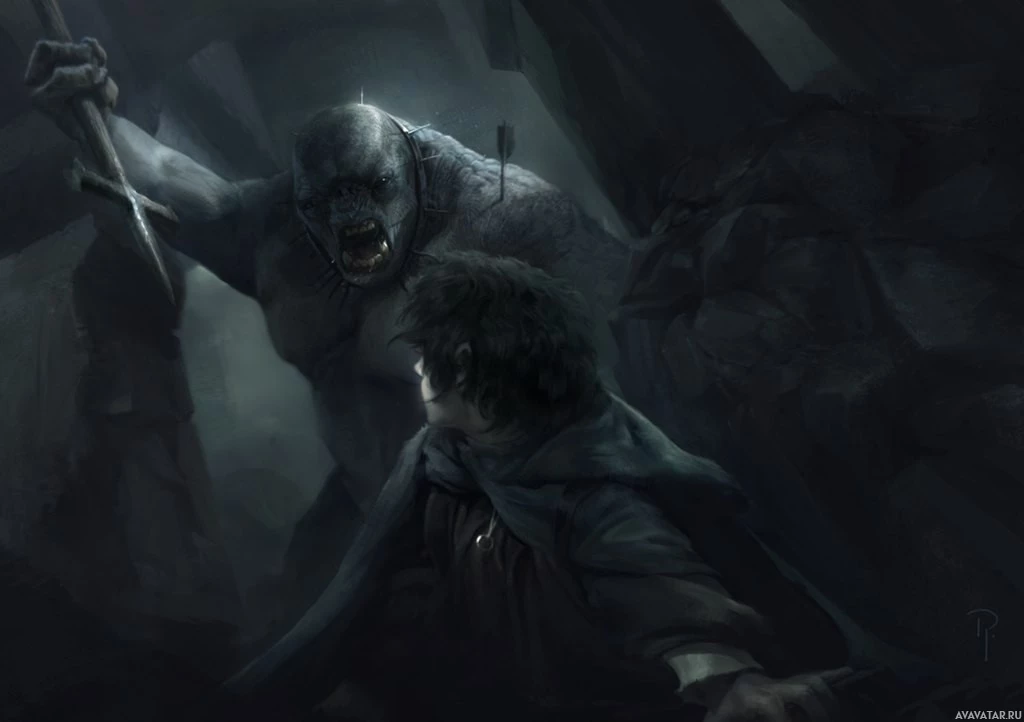pointed ears, typical of Hobbits from Tolkien's works, who seems to be Frodo Baggins from "The Hobbit" and "The Lord of the Rings" series. This character is often associated with the One Ring and its quest. On the right side of the image, there is a creature that resembles an ogre or troll, known for their strength and menacing appearance in various folklore and