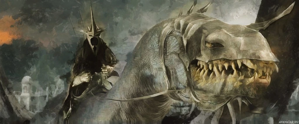 film series, depicting a character known as Witch-king riding on the back of a giant creature. The setting appears to be a battlefield or