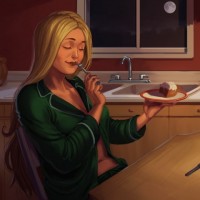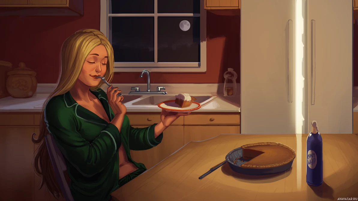 a domestic setting. The lighting is warm and soft, contributing to the nighttime ambiance.