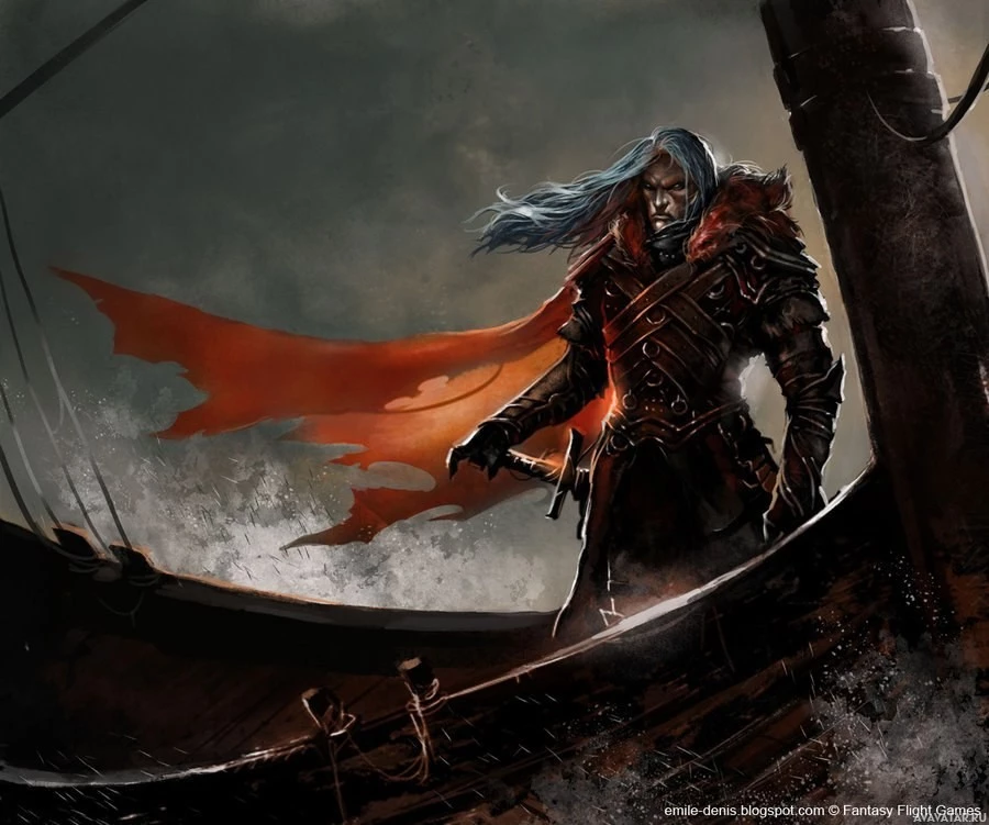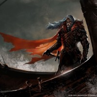 the edge of a ship. The character is wearing armor and has long, flowing hair that could be described as fantastical. They are also holding a weapon in their right hand, suggesting they might be preparing for combat or have just engaged in battle. The setting appears to be stormy seas at night, with