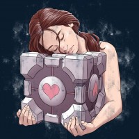 closed eyes, clasping a game controller that resembles a heart shape. She appears to be asleep or in