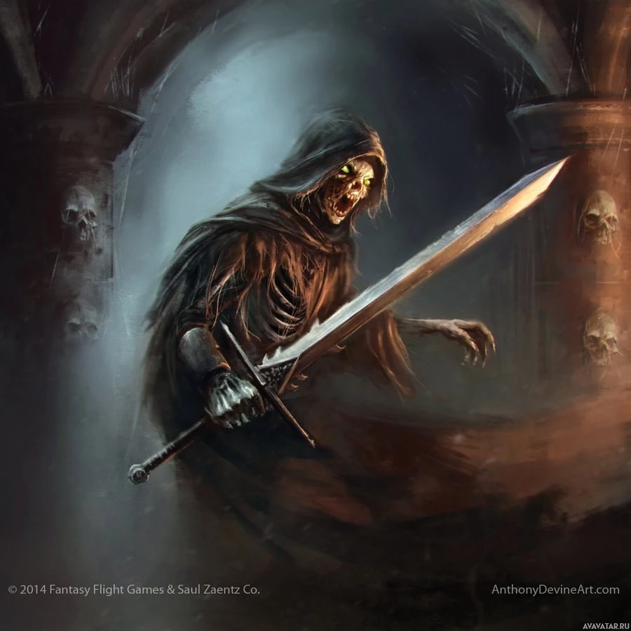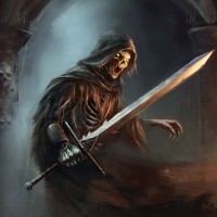 medieval attire, including a cloak or draped garment that covers its body. In the background, there are dark, ominous elements such as archways and what appear to be skulls embedded into the structure, contributing to