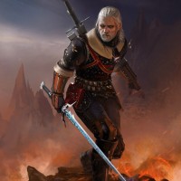 The image shows a character known as Geralt of Rivia, the main protagonist from "The Witcher"