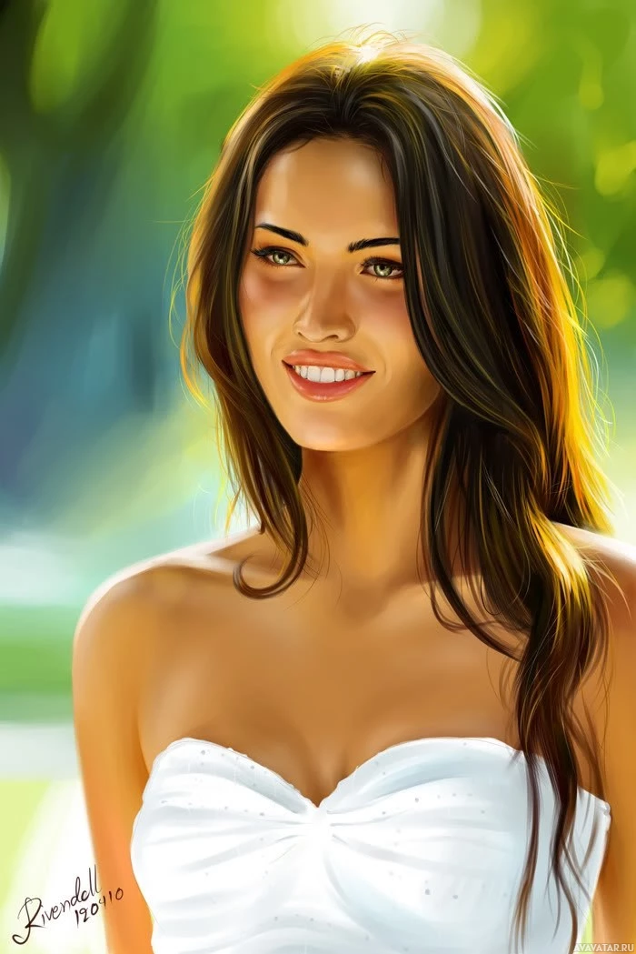 an outdoor setting during daytime. The artwork has a vibrant quality, and the subject seems happy or joyful. This image could be associated with celebrity culture or fashion due to her elegant appearance and attire.