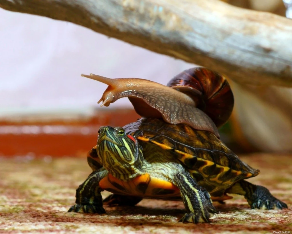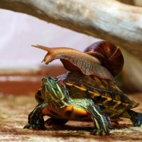 a carpeted floor. Resting on the turtle's shell is a snail, which seems to have climbed up from below. The scene is unusual because one typically does not expect to see a snail riding atop a turtle like this. This kind of interaction would be more common in