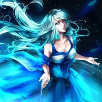 The image features an animated character, a girl with turquoise hair. She is wearing a dress and appears to be standing in front of a cosmic or magical background that has a starry sky element and a vortex-like pattern. There are also feather-like elements around her, suggesting movement or the presence of magic. The character's expression seems contemplative or calm as she gazes upwards with her hands slightly raised in a graceful pose.