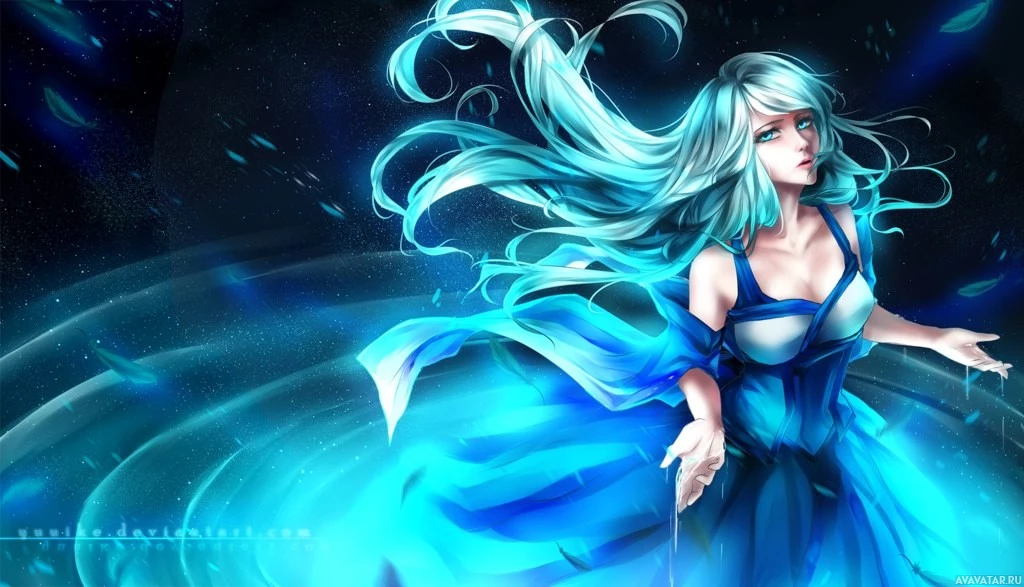 На картинке изображен анимированный персонаж, девушка с бирюзовыми волосами. Она носит платье и, кажется, стоит перед космическим или магическим фоном, который имеет элемент звездного неба и вихревой узор. Вокруг нее также есть похожие на перья элементы, предполагающие движение или наличие магии. Выражение персонажа кажется созерцательным или спокойным, когда она смотрит вверх с слегка поднятыми руками в изящной позе.