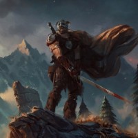 rocky terrain with mountains in the background under an overcast sky. There's a cloak draped around their shoulders, suggesting they are in cold or harsh