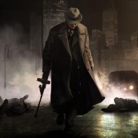 The image depicts a scene that seems to be set in a dystopian or noir-inspired environment. There are several people present: 1. In the foreground, there is a person who appears to be male and dressed in attire reminiscent of classic noir detectives, including a trench coat and fedora hat, giving off
