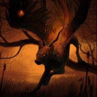 a dark forest setting at night, with twisted trees and orange glowing embers scattered around, suggesting some sort of magical or mythical fire. The creature itself seems to have a somewhat