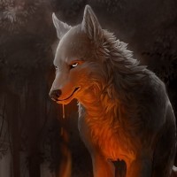 The image depicts a wolf standing in what appears to be a dark, forest-like setting with some trees in the background. There are also flames on the ground before the wolf, which could suggest a campfire or a similar source of heat and light. The artwork has a fantasy or mythical vibe due to the dramatic lighting and the intense focus on the wolf's features.