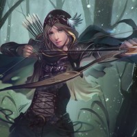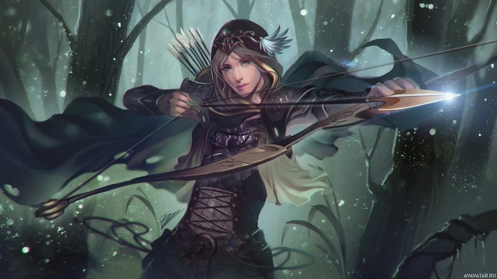 fantasy attire, including a cloak and a hood with a pointed collar. She's holding a bow in her hands, suggesting she might be involved in archery or hunting. Her expression is focused, and she has light-colored hair styled in a manner that is common for