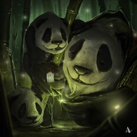the dim lighting and the presence of fireflies. One panda is holding what seems to be a lantern with