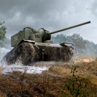 military vehicle with a large barrel, possibly representing a World War II era tank due to its design and appearance. Smoke is visible around the tank, suggesting it may have been engaged in combat or maneuvering quickly through the area. The background features what looks like