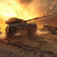 The image shows three tanks in a desert setting during what appears to be either sunrise or sunset, given