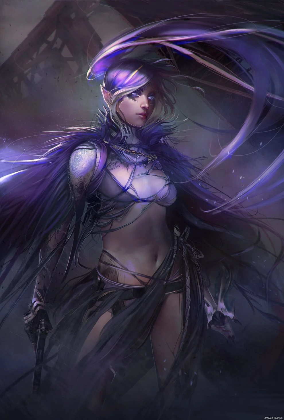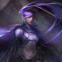 purple hair. The character is wearing elaborate, intricate armor and has an ethereal appearance, with flowing hair and mystical elements such as what looks like starlight or