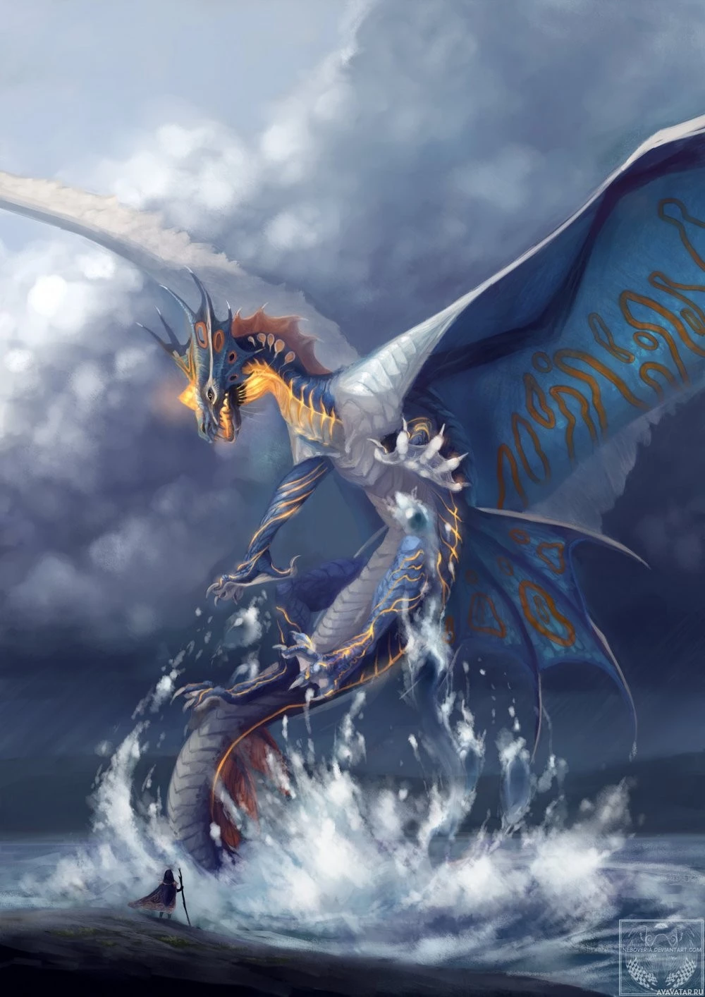 a mythical creature with the body of a serpent and the wings and head of a bird, often associated with dragons in folklore and fantasy genres. The dragon appears to be in motion, possibly flying or swimming near