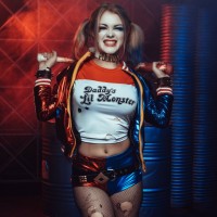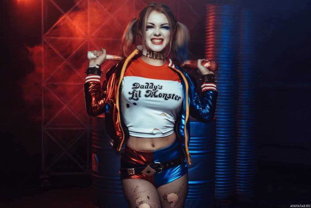 На картинке изображен человек, одетый как Харли Квинн, персонаж из серии «Бэтмен». Они носят красный и синий костюм с фирменными элементами костюма персонажа, такими как шутовская шляпа и макияж. Человек, кажется, позирует для фотографии и находится в комнате с тусклым световым эффектом, который создает угрюмую атмосферу.