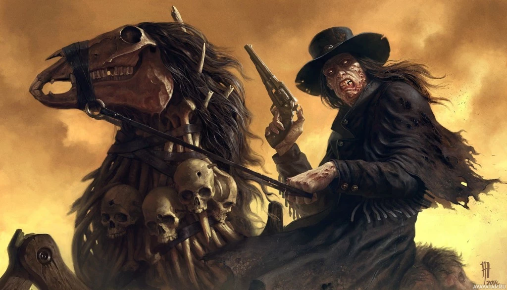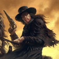 a dark sky. The overall style suggests a blend of Western themes with elements of horror, possibly representing a zombie-like scenario given the presence of
