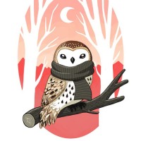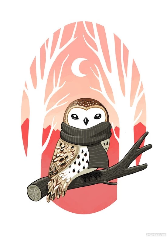 На картинке изображена сова, сидящая на ветке дерева. Он, по-видимому, проиллюстрирован стилизованным и красочным образом, с теплыми цветами, предполагающими восход солнца или лунный свет. На заднем плане изображены силуэты деревьев, способствующие естественной обстановке иллюстрации.