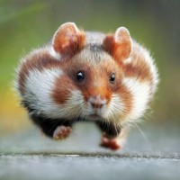 a small rodent, commonly known as a hamster. It is seen in motion, running on what appears to be