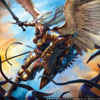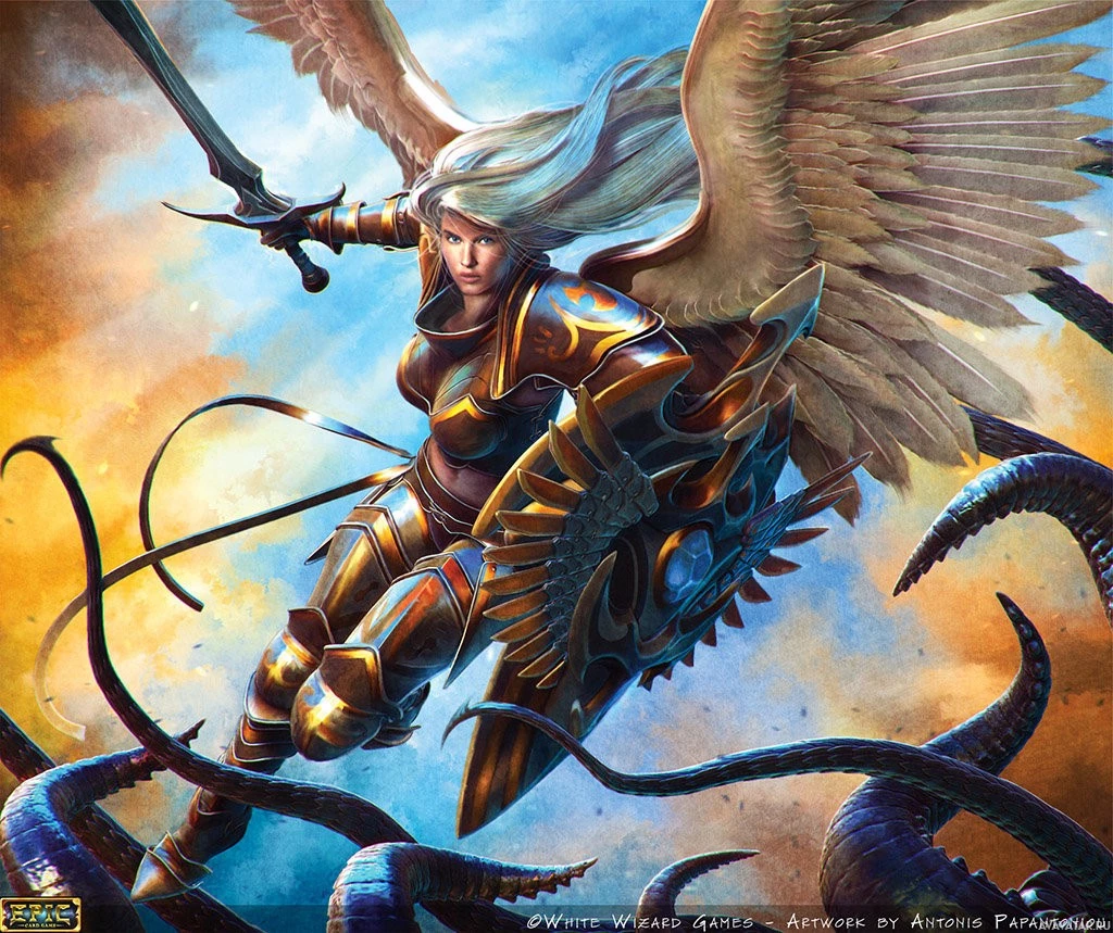 a battle scene, with the angel appearing victorious over the creature beneath her. The style of the artwork is detailed and dramatic, fitting for a fantasy-themed genre such as