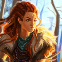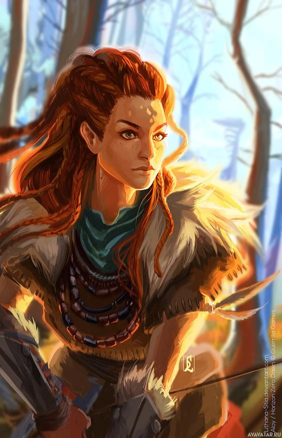 red hair, is wearing animal hide clothing, and is holding a bow. The setting looks like a forest or wilderness area, which aligns with