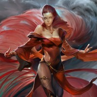 red attire and seems to be in motion or dancing, given the dynamic posture and the fabric's movement. The background features a contrasting dark sky, which adds to