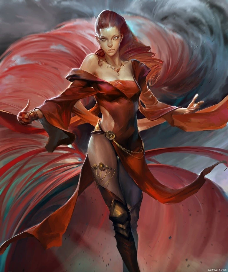 the dramatic effect of the scene. The character is the central focus of the image, with her vibrant clothing standing out against the more