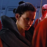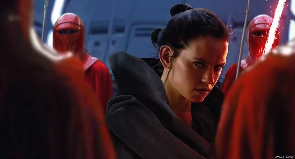 outfit with a lightsaber in her hand, ready for action. Behind her are several stormtroopers or Imperial soldiers, dressed in their distinctive