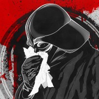 the Star Wars franchise. He is depicted holding a mask and a drink with his right hand while his left arm appears to be missing, which is consistent with how his character is portrayed in the films. The background has a stylized red-and-black color scheme that gives it an edgy appearance. The image likely represents