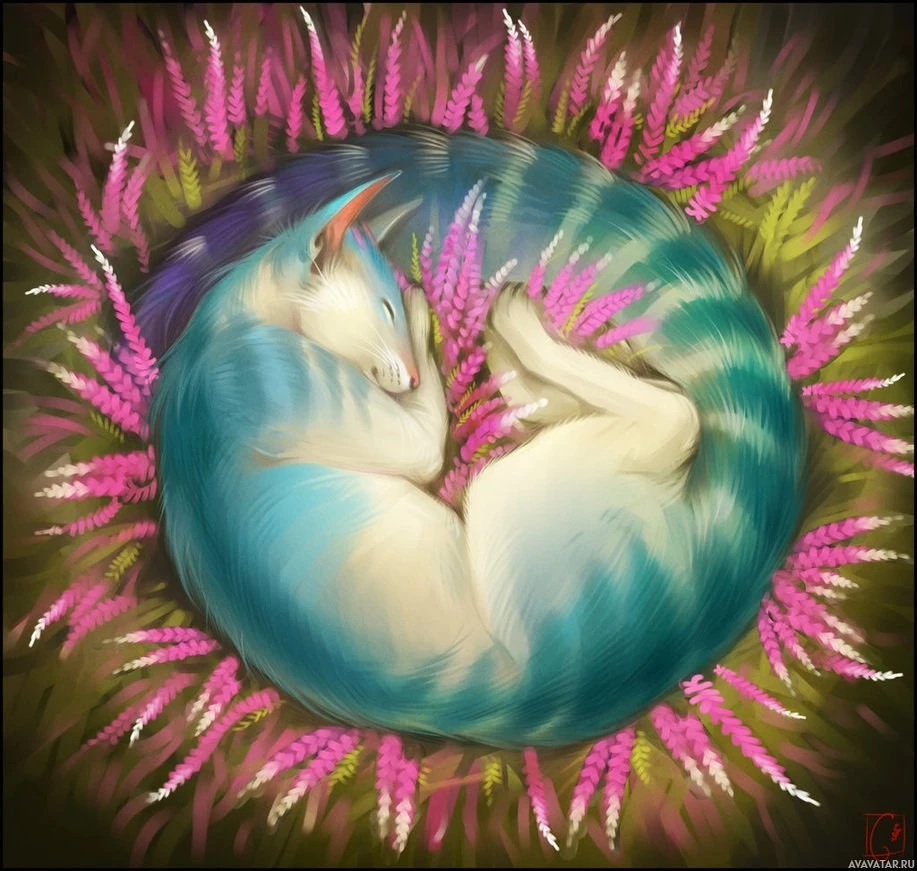 a fantastical scene featuring a cat curled up in a sleeping position. The cat appears to be multicolored, with shades of blue, white, and grey on its fur. It is surrounded by what looks like