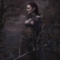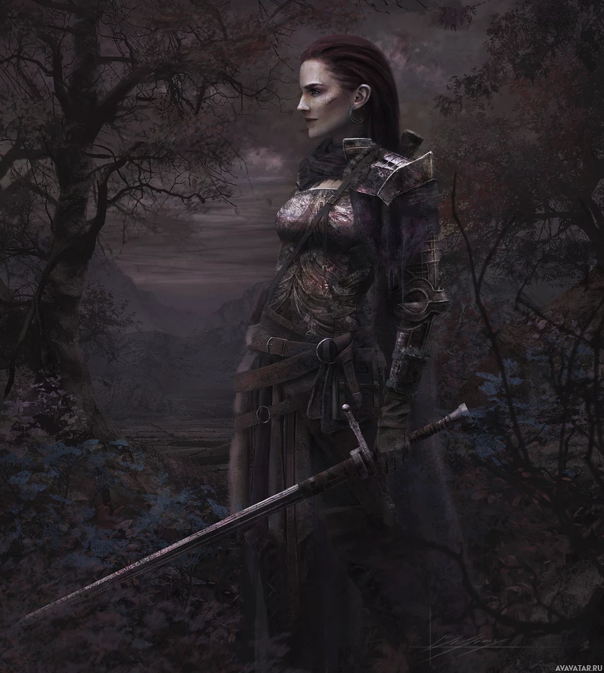 a female warrior or adventurer. She is wearing armor and holding a sword, suggesting she might be in