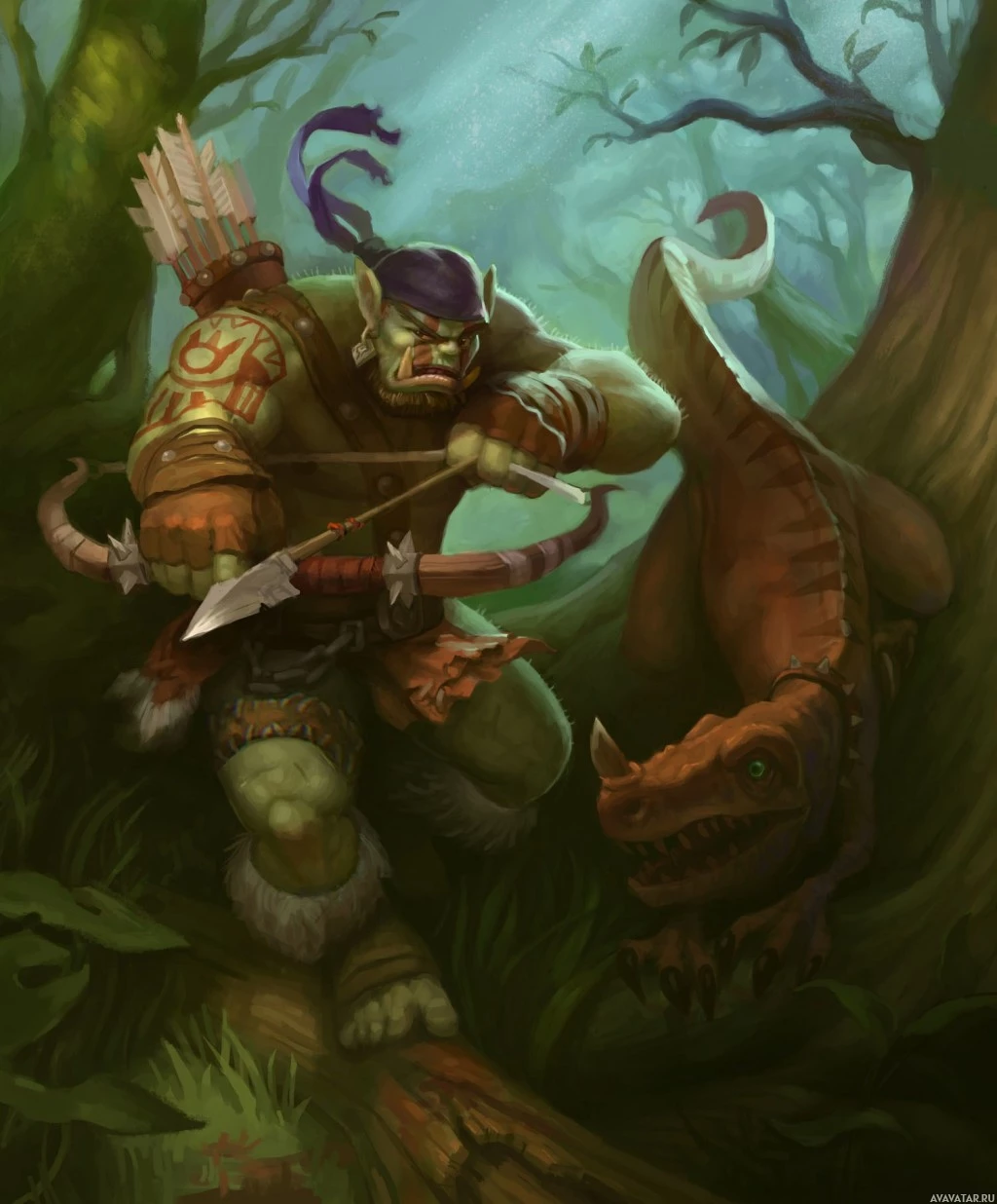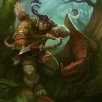 a fantasy scene featuring an orc archer in the forest. The orc is holding a bow and appears to be aiming it at a nearby dinosaur, which looks like a Velociraptor. The setting is lush and green with