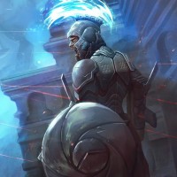The image depicts a fantasy-themed illustration of a warrior. This character is wearing armor with a helmet and is holding what appears to be a shield or weapon. The background suggests a battlefield or a scene from