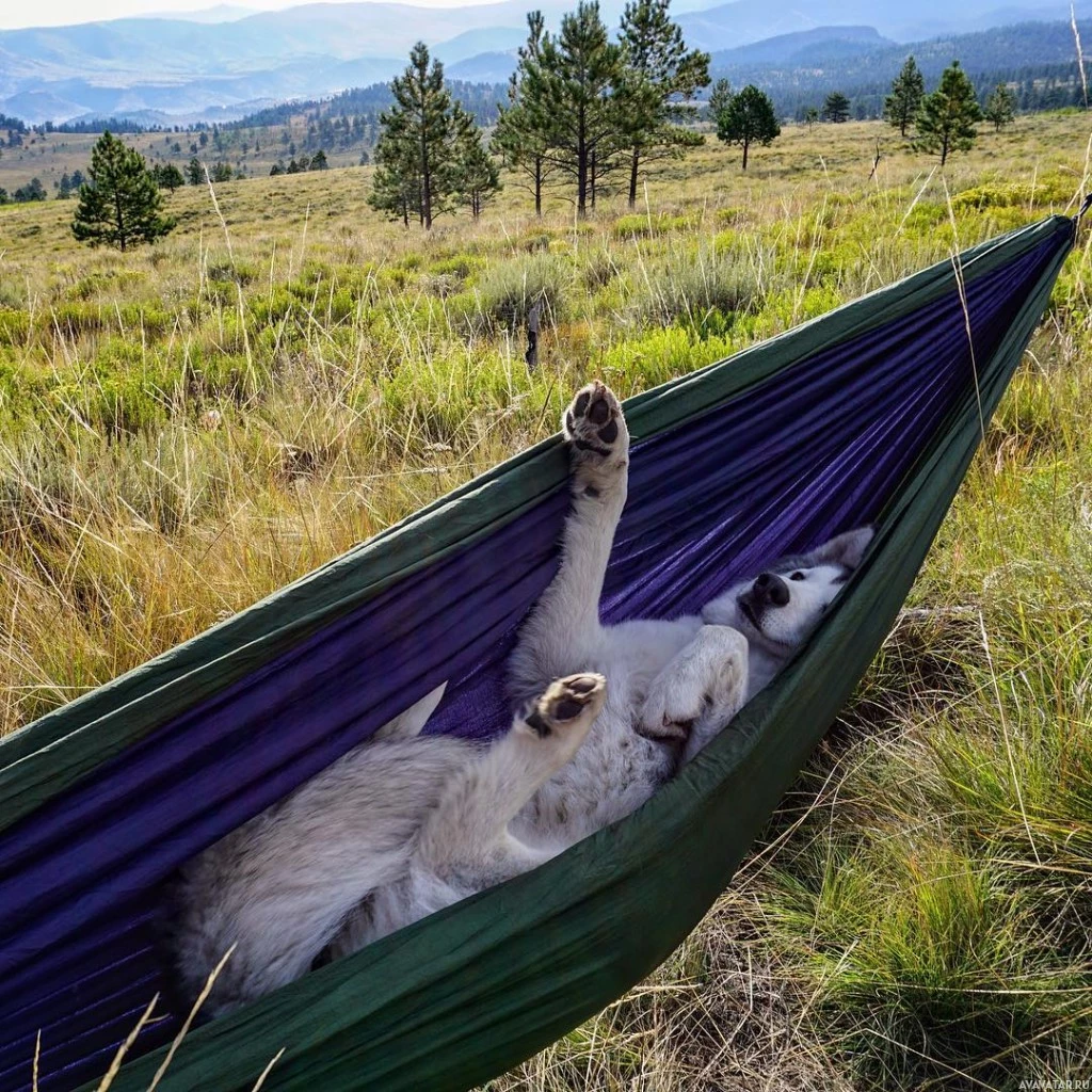На картине изображена собака, а именно хаски, лежащая в гамаке. Гамак расположен на открытом воздухе на травянистой местности с некоторыми деревьями и горами на расстоянии под ясным небом. Собака кажется расслабленной и наслаждается своим временем в удобном положении, обеспечиваемом гамаком.