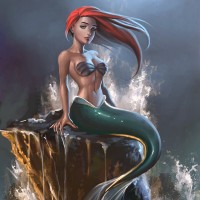 The image depicts an illustration of a mermaid sitting on a rock amidst