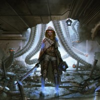 a young girl, standing in the foreground with a determined expression. She is dressed in what looks like a sci-fi or fantasy outfit, suggesting she might be from