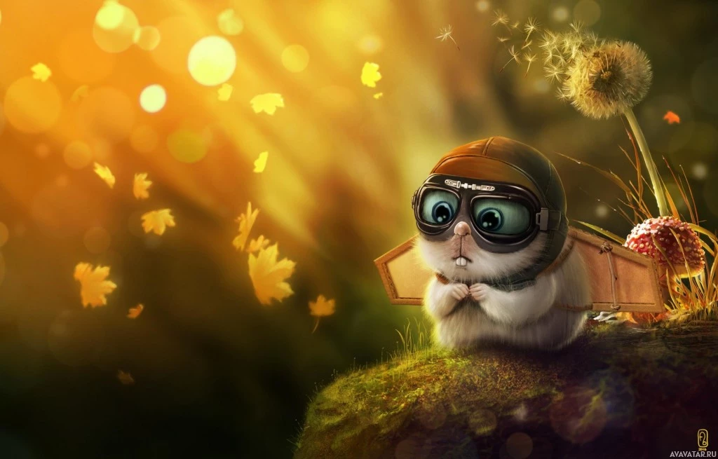 an animated character that appears to be a hamster dressed in a pilot's uniform, complete with goggles and a helmet. It is set in what looks like an autumn forest, with