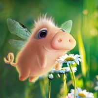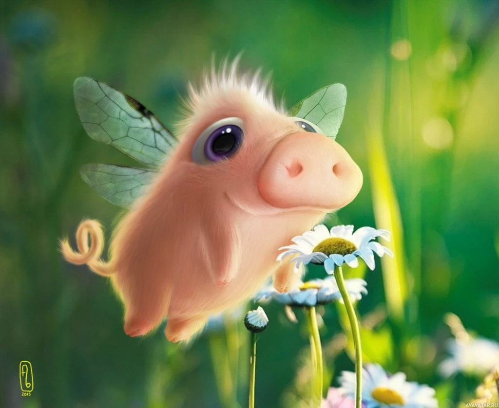 The image shows a whimsical illustration of an animal that resembles a pig with wings and antennae, suggesting it is a character from