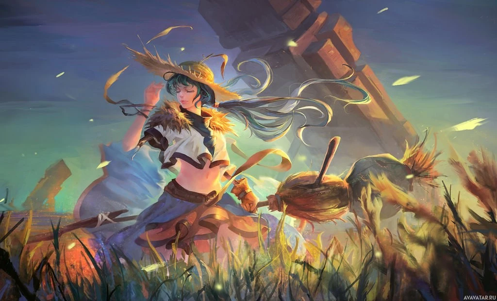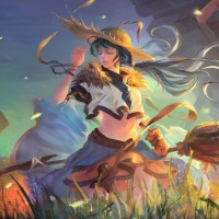 The image depicts a character, which appears to be an animated or stylized representation of a girl. She is wearing a hat and has a staff in her hand, suggesting she might be on an adventure or exploration. The setting seems to be outdoors at dusk or dawn, with the sky transitioning from dark to light. There are also several leaves or petals floating in the air, adding