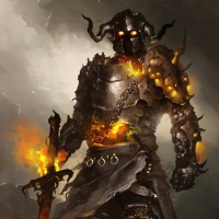 a skull design on the chest and has flames emanating from their body. They are holding a sword with both hands and appear to be emerging from