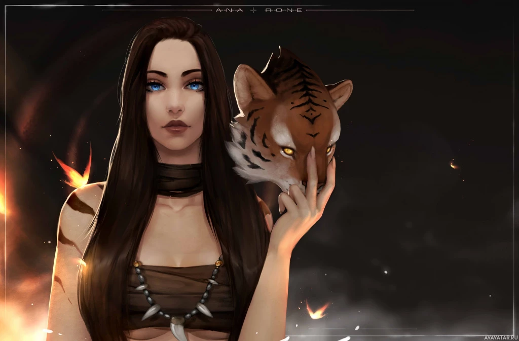 a dark top and has a tribal or fantasy-inspired look to her outfit. In her hand, she is holding what appears to be a mask shaped like a tiger's face. Behind her, there are flames, indicating that she might be in a setting that involves fire or destruction. The lighting in the image suggests it could be nighttime or in a dimly
