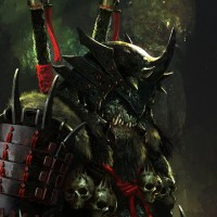 sharp teeth and pointed ears, wearing armor and holding what appears to be a weapon. The style of the artwork gives it a gritty and intense feel, fitting for a setting that would likely involve battles or quests within
