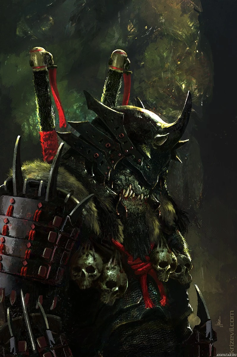 a fantasy creature that resembles an orc, which is a common term for a fictional race in various media, often associated with dark fantasy genres. This particular depiction showcases the creature with a menacing appearance, featuring