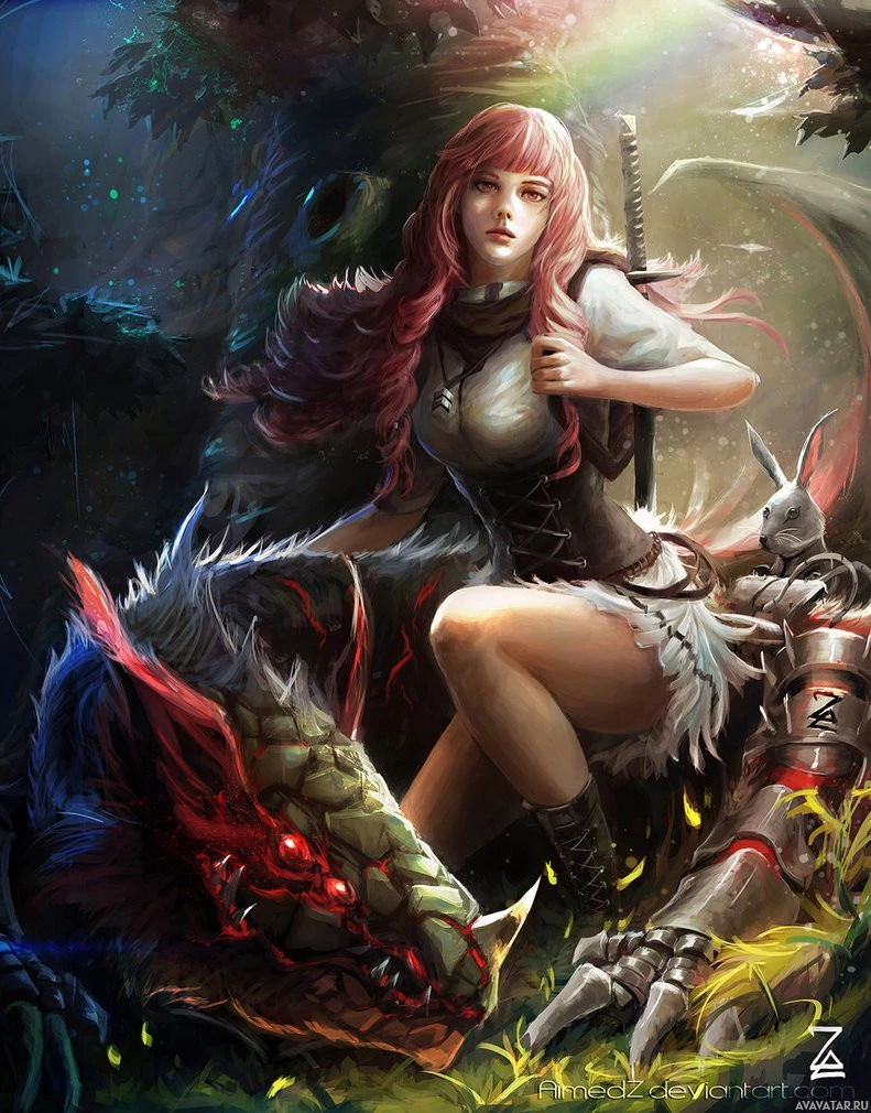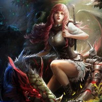 a female character with pink hair, dressed in fantasy attire. She has an armor on one side and is holding a sword. Next to her, there are two creatures: one is a wolf-like creature with red fur and